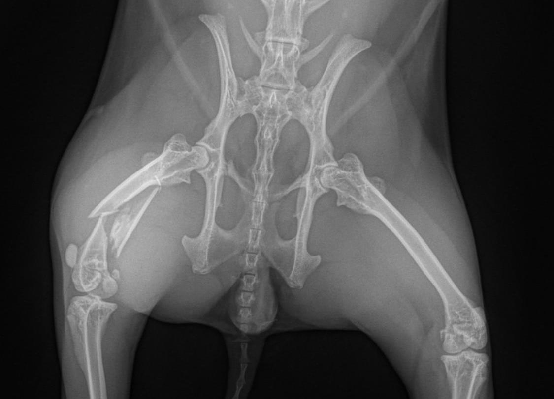 I was called to the Animal Clinic of Morris Plains to fix the fracture. The repair involved using a tiny plate, 7 screws and 2 pins.